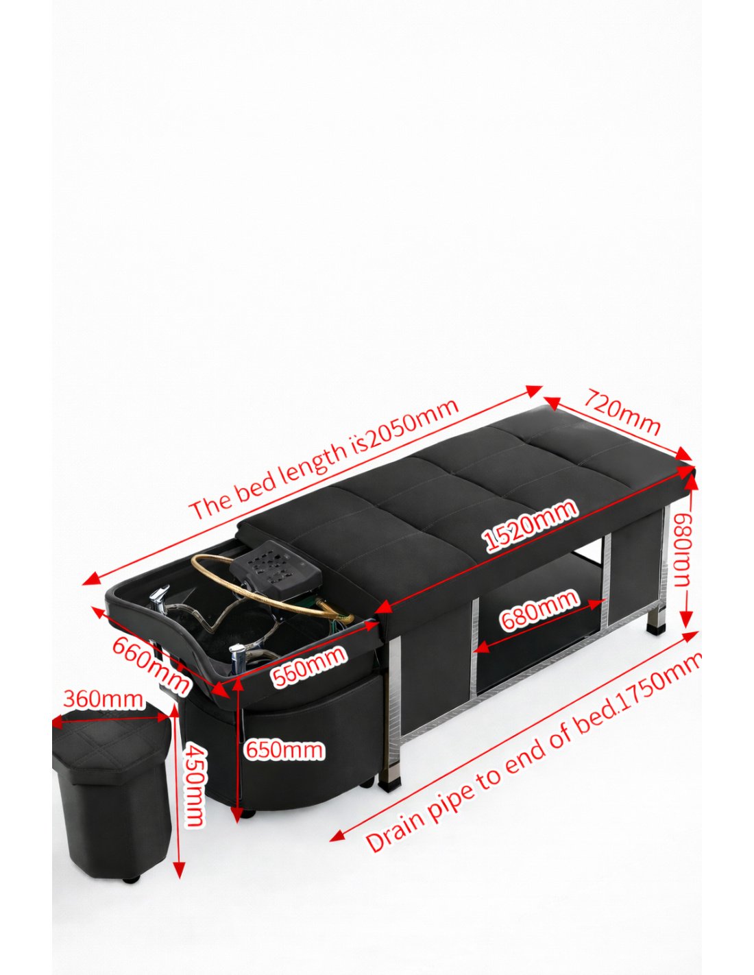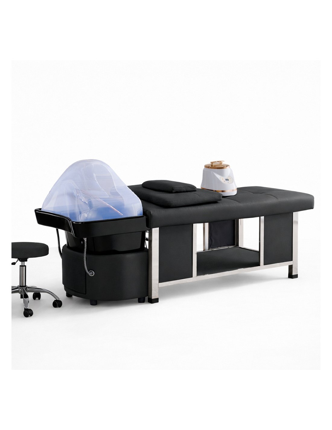 Tvirta konstrukcija ir praktiškos laikymo vietos leidžia patogiai atlikti galvos SPA, plaukų priežiūros ir relaksacines procedūras vienoje vietoje